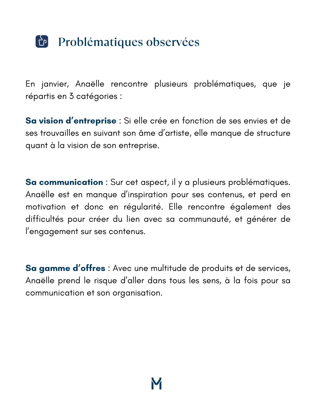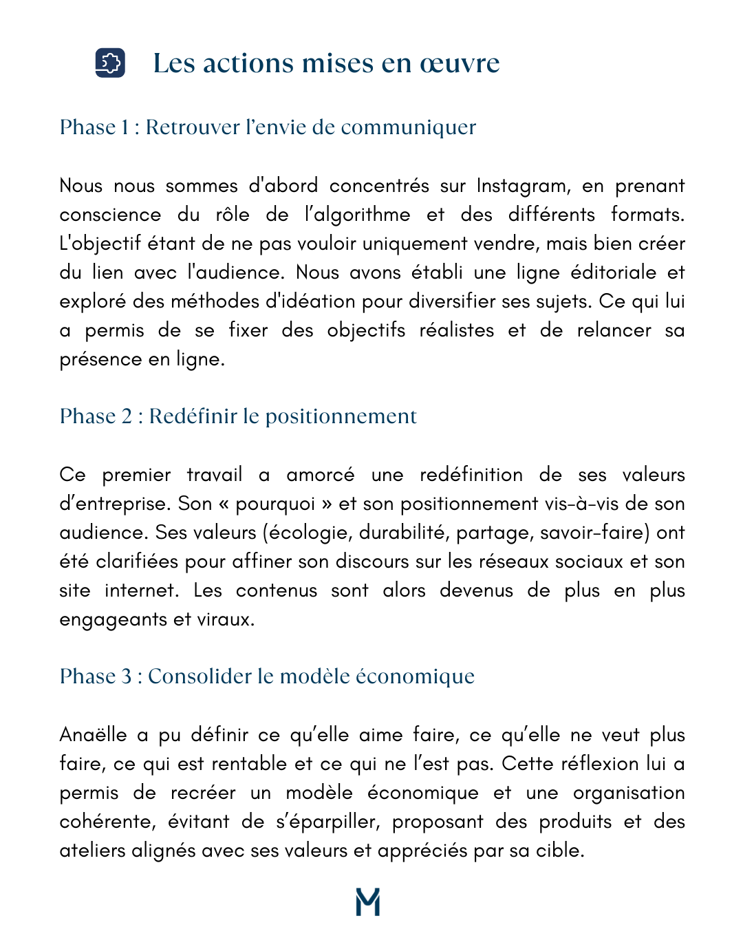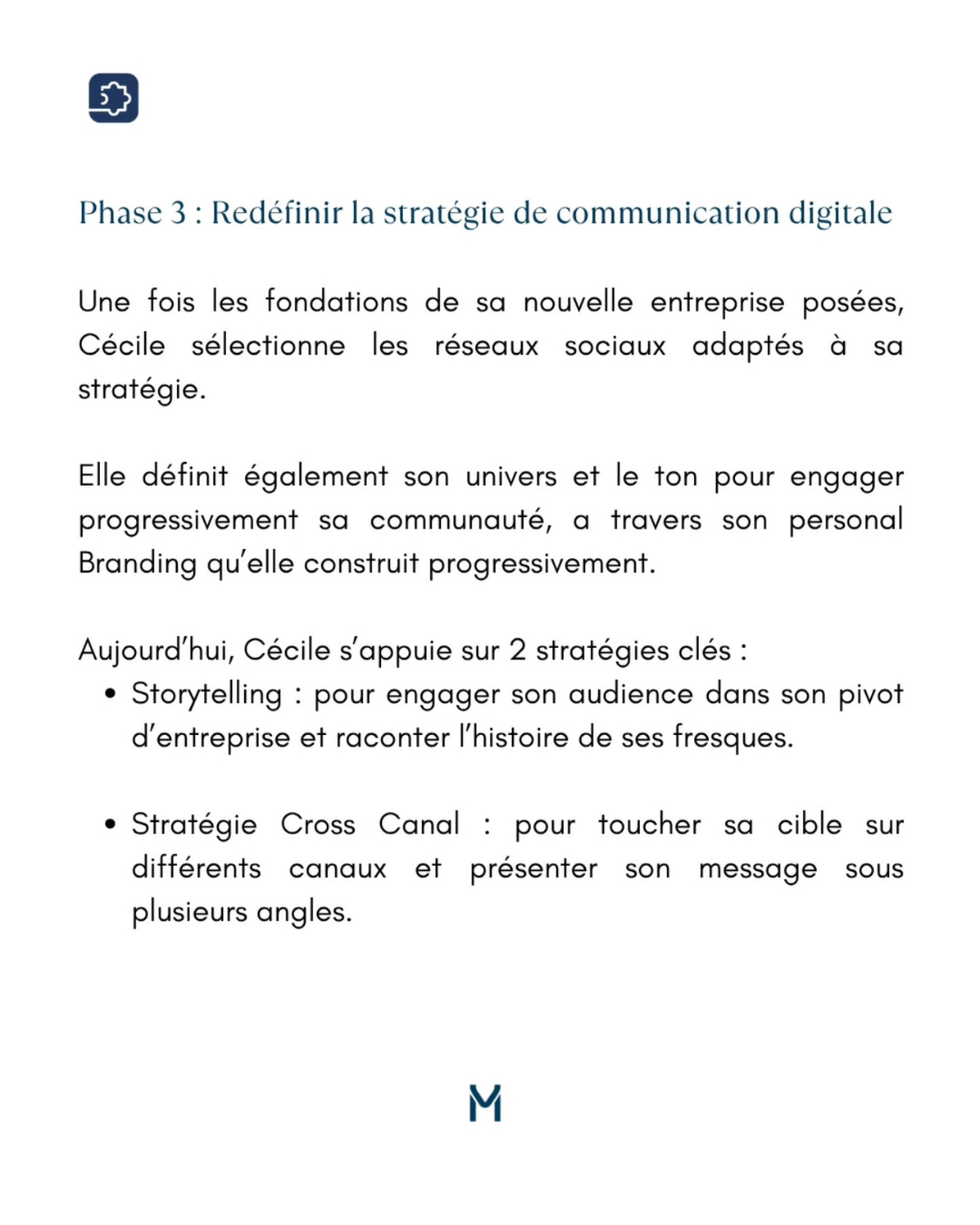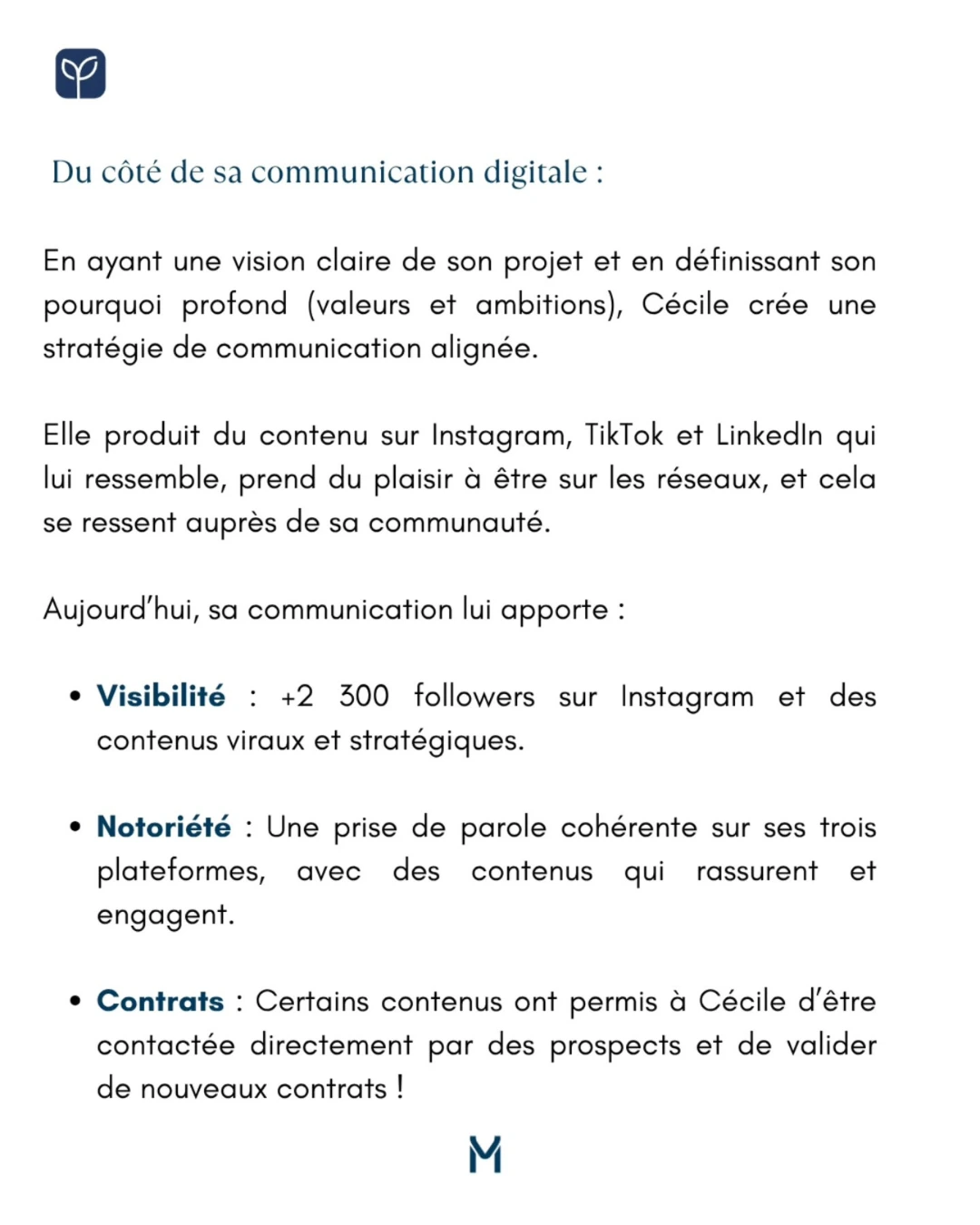 À la fin de votre accompagnement, vous recevez votre dossier stratégique regroupant tous les conseils de l’accompagnement, votre ligne éditoriale détaillée ainsi que des conseils supplémentaires pour maintenir votre présence en ligne et développer vos réseaux sociaux.